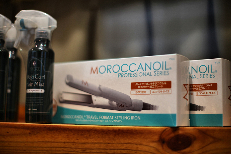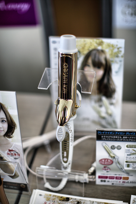 헤어 아이롱과 제품들이 전시되어 있다