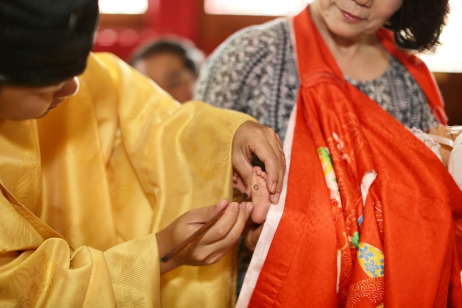 아이의 양쪽 발바닥에 동그란 도장을 찍습니다