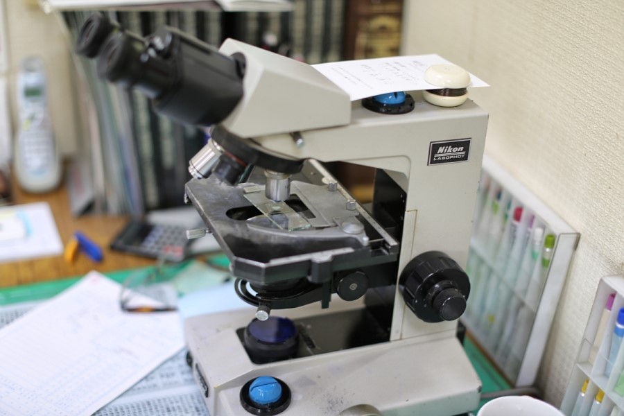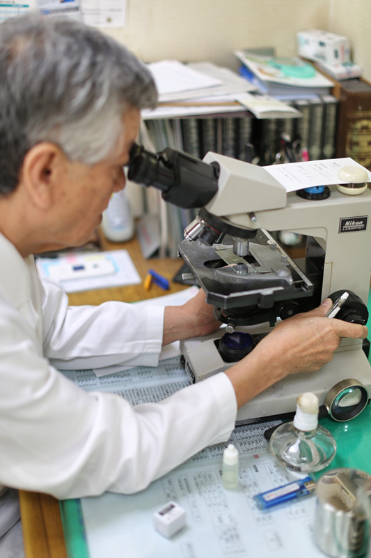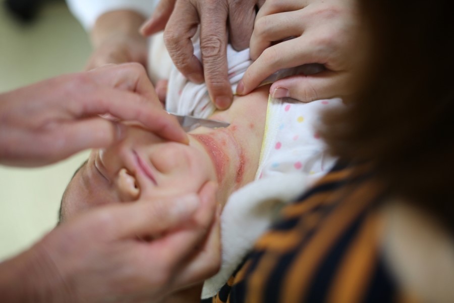 칼 비슷한 도구로 목의 고름을 체취합니다