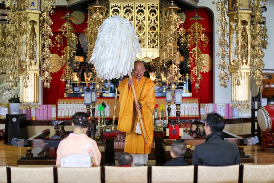 스님이 큰 빗자루? 비슷한 걸 들고오신다