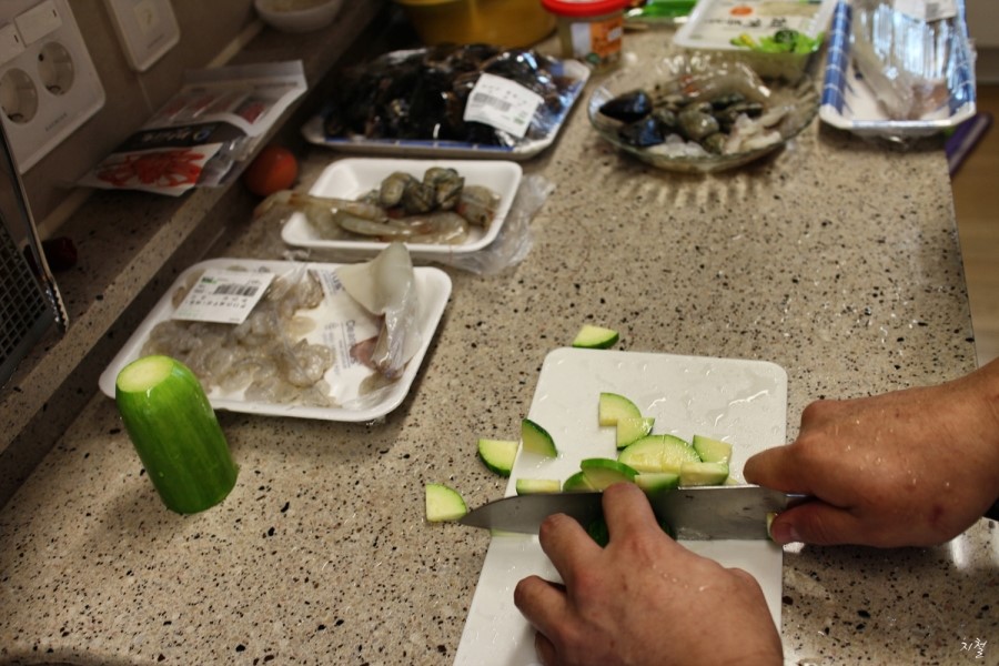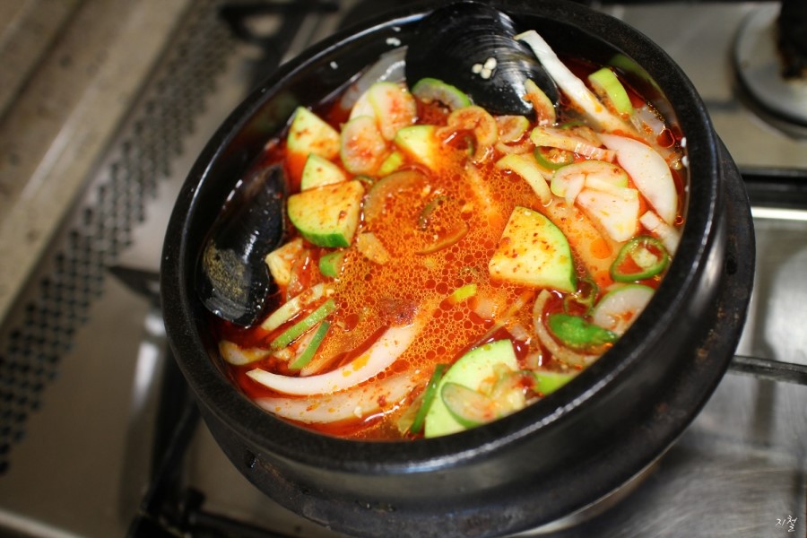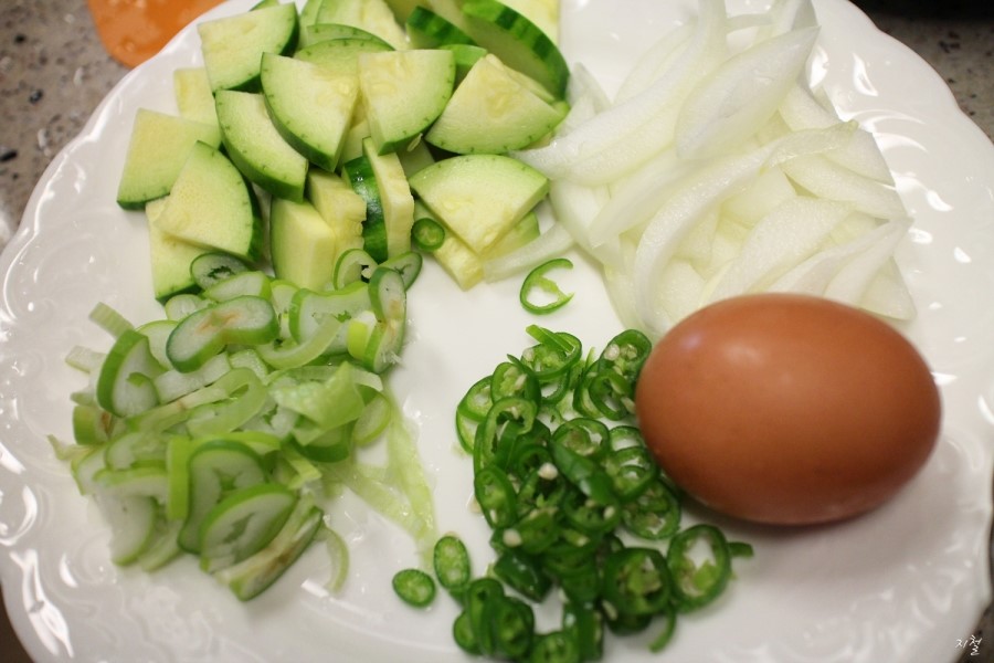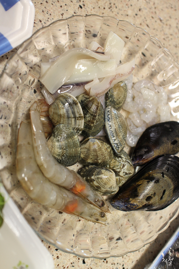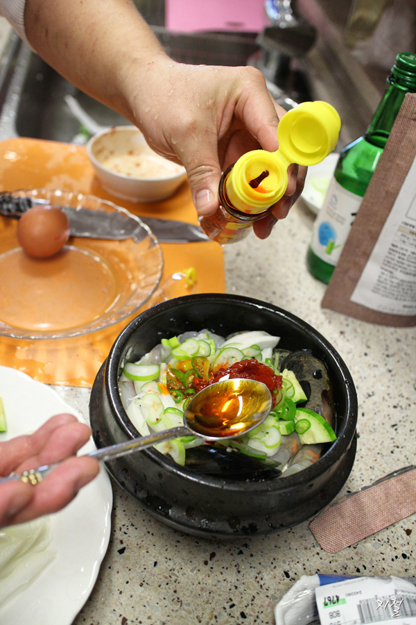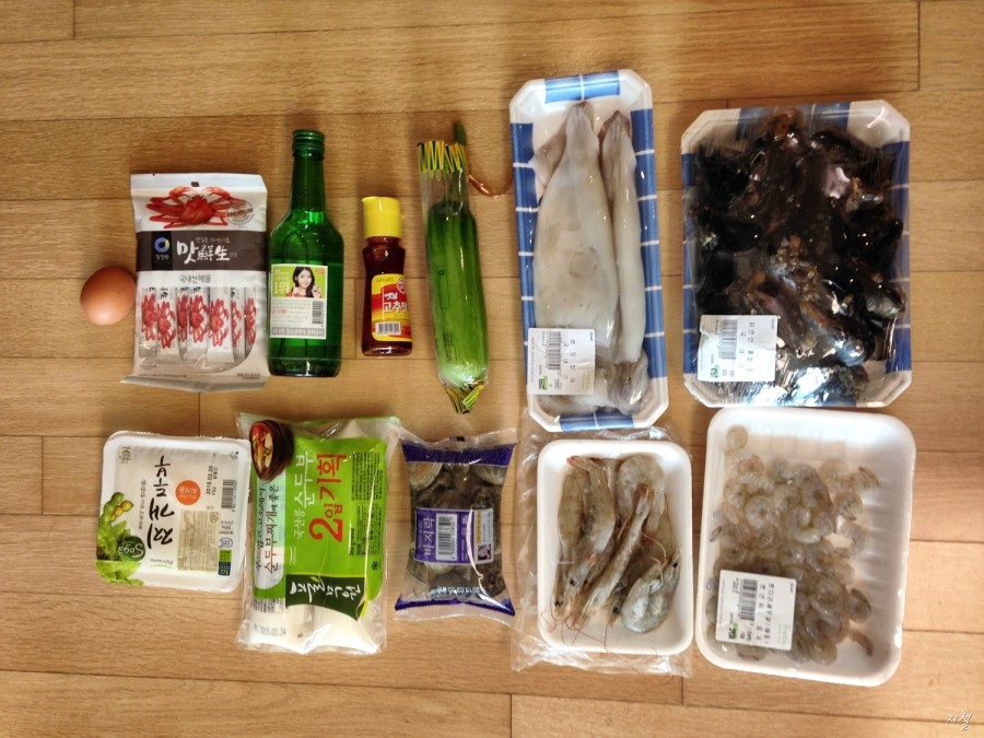 계란1개 해산물조미료 소주 고추기름 호박 오징어 홍합