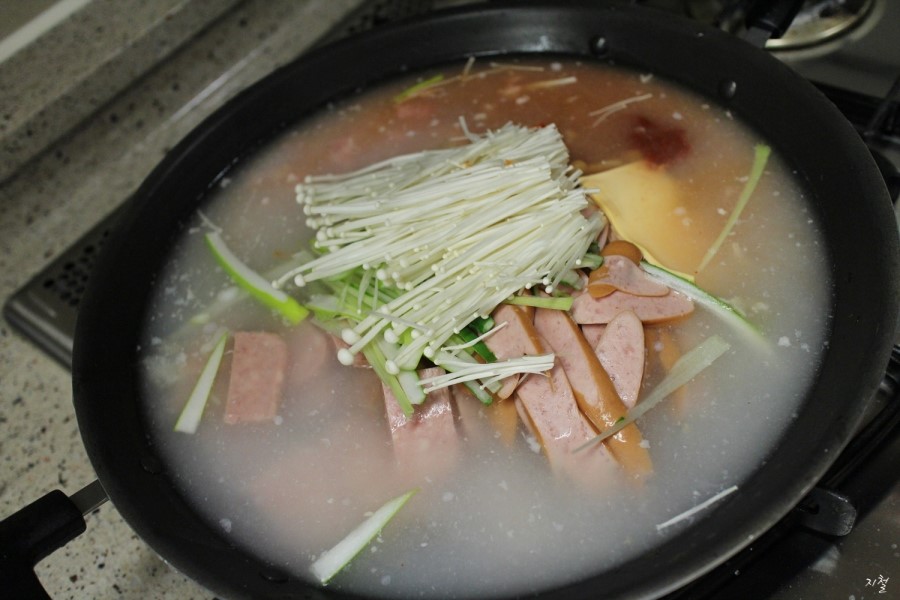 사골육수 청양초 고춧가루 파 팽이버섯 갈은 고기 스팸