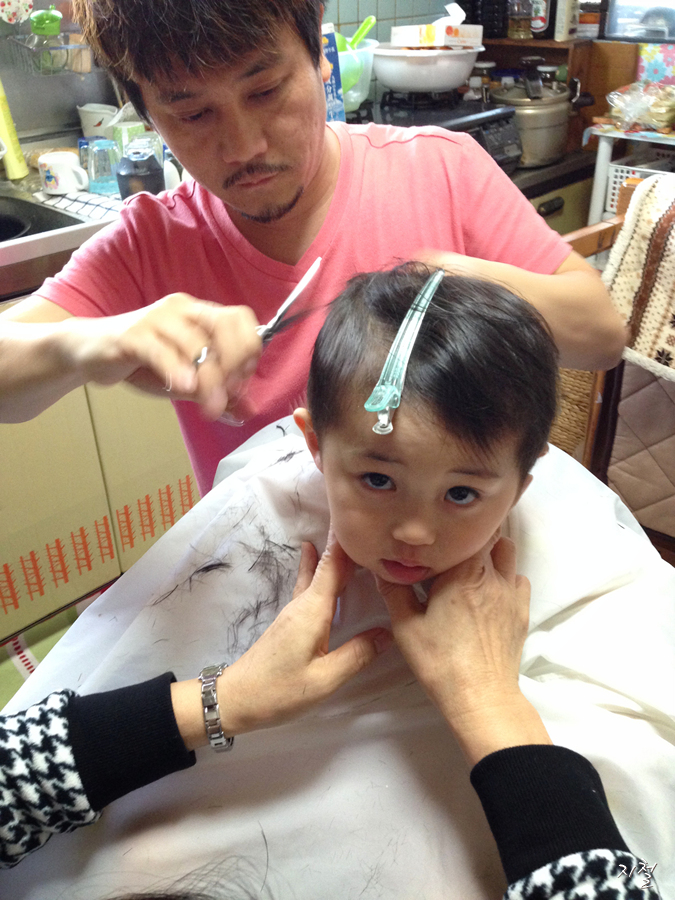 가족들의 머리를 잘라주는 착한 쵸루씨