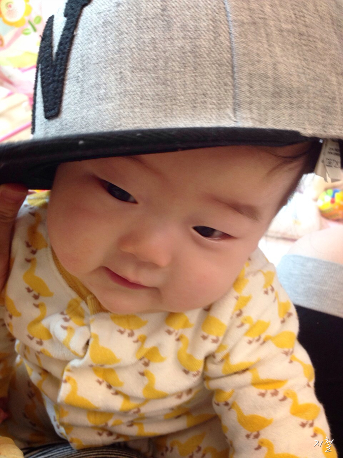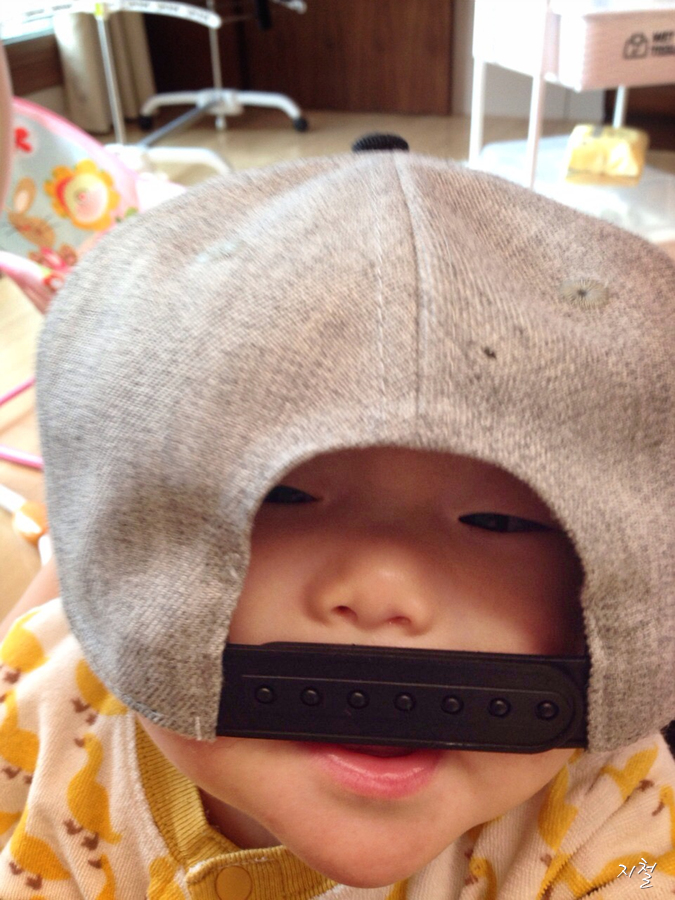 아빠 모자로 놀고 있는 란이