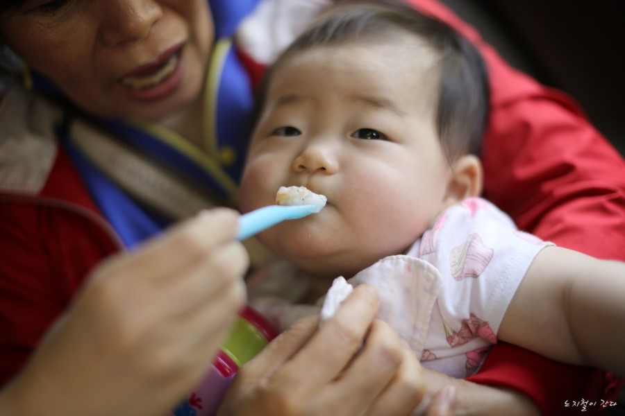 오전 11시와 오후 6시에 이유식을 먹이고 있습니다