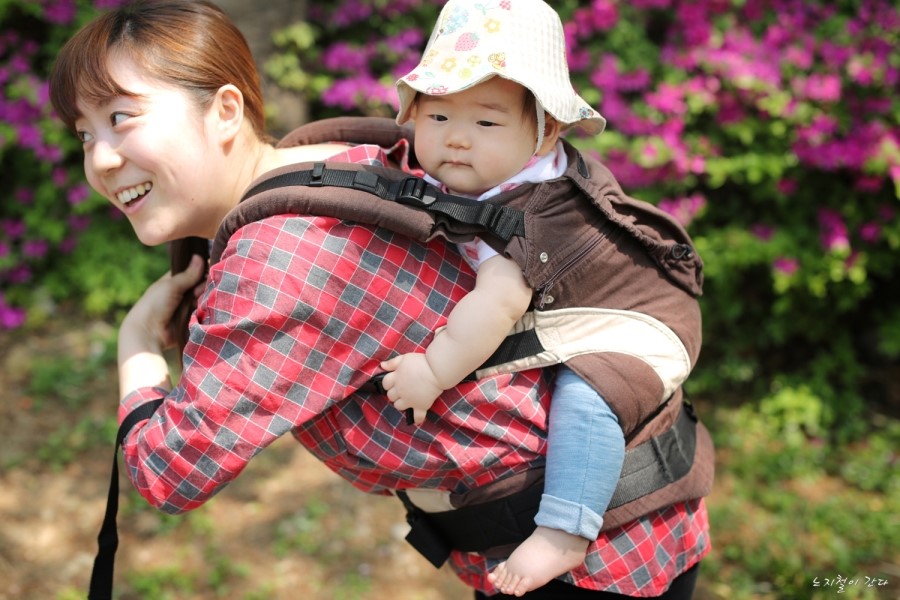 엄마 등뒤에 업혀서 조용히 잠을 잡니다