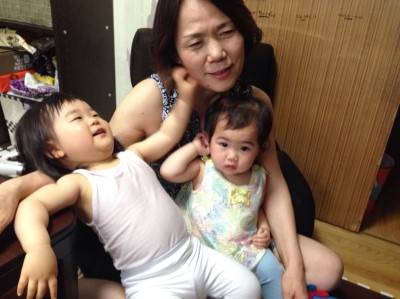 할머니 귀를 만지고