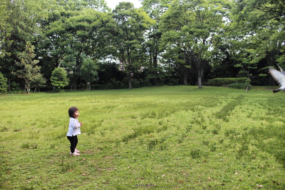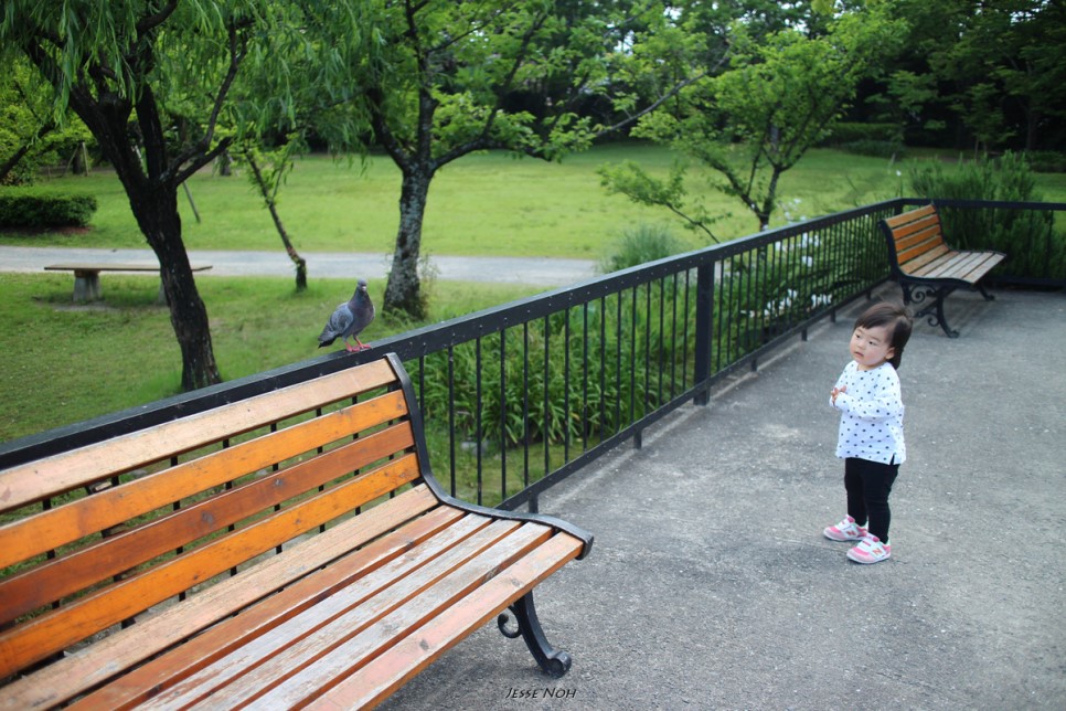 비둘기에게 말을 걸고싶어하는 란이
