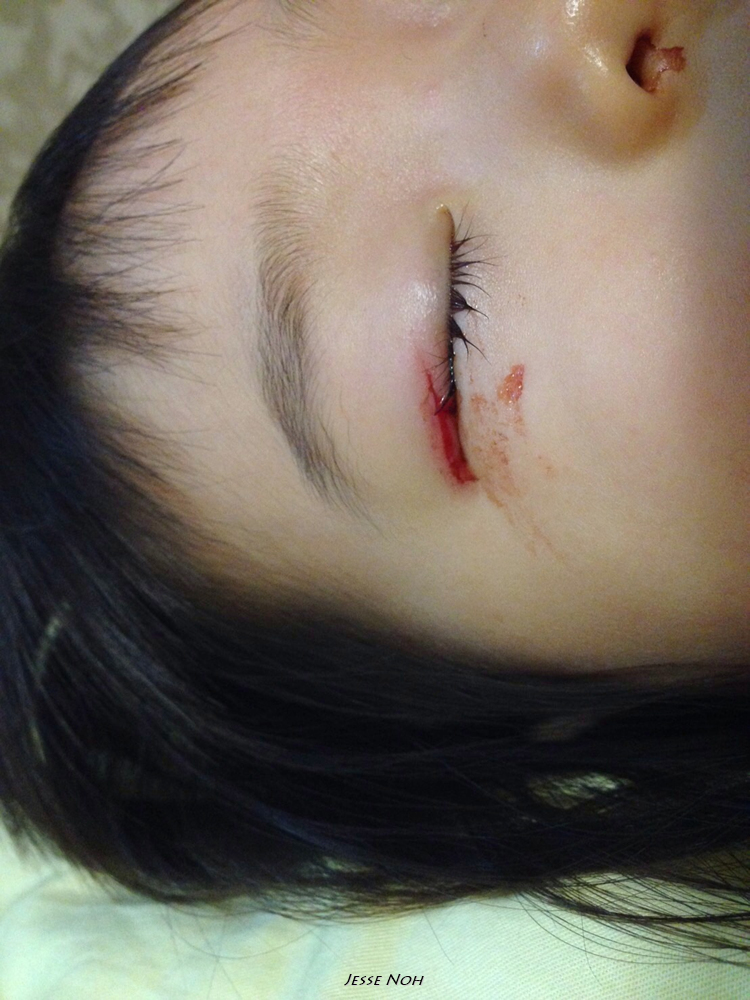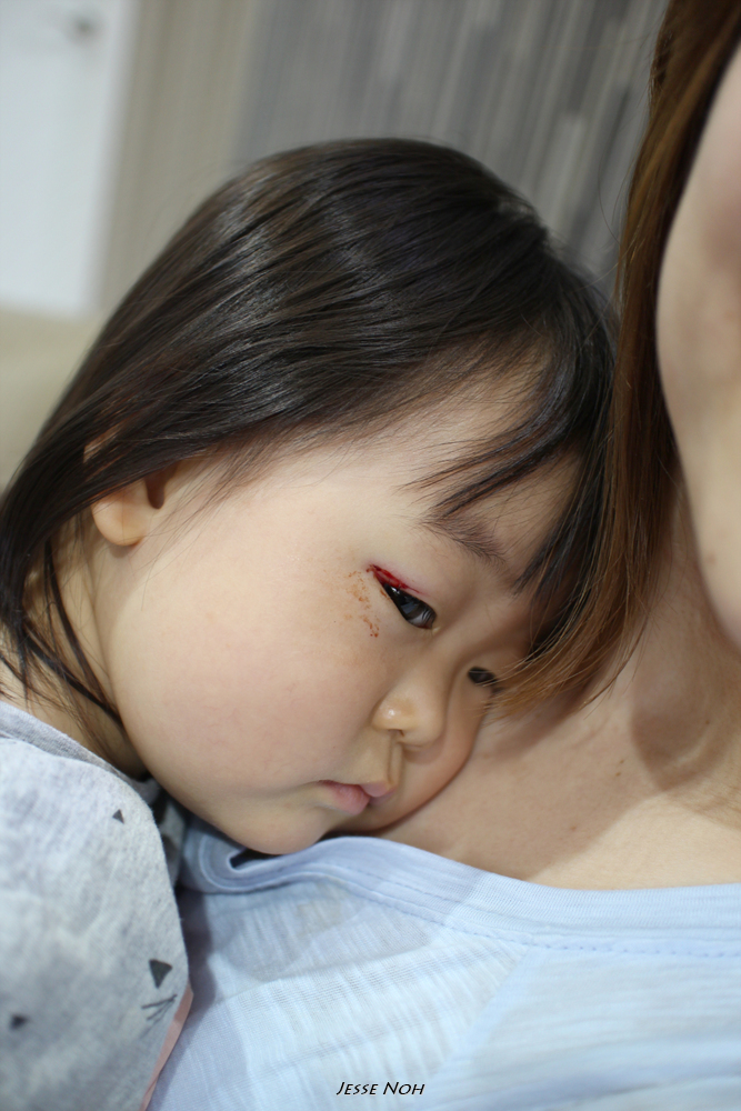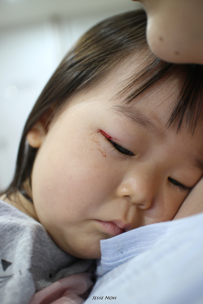 의자가 뒤로 넘어가면서 그대로 떨어지면서 플라스틱 책상 모서리에 눈을 부딪혀 눈꺼풀이 찢어졌다는 연락이였습니다 믿기지 않았습니다 플라스틱 책상에??? 음.. 하던일을 중단하고 바로 병원으로 달려갔습니다 집 바로 앞에 강남세브란스 병원이 있었지만 저도 저희 어머니도 이제는 더이상 응급실을 믿지 않기에 근처의 베스티안병원(중형병원)으로 가라고 했습니다 약간의 시간차이로 베스티안 병원에 도착해서 본 란이의 눈은 다행히도 피는 멈춰 있었지만 작은 상처같지는 않았습니다 그리고 베스티안 병원에서는 눈을 꿰메야 할 것 같다 아이의 전신마취가 필요할 것 같은데 위험성이 있어서 어렵고 성형외과 전문 의사도 없으니 강남세브란스병원으로 가라는 답을 주었습니다 여기서 고민을 시작합니다 아.. 싫다 정말 응급실은... 그럼 란이가 다니는 소아과에 한번 가서 의견을 들어보자!! 소아과로 이동합니다 저희가 기대한 대답은 아... 이정도면 그냥 상처 제생 밴드정도만 붙여도 될 것 같은데요!! 였습니다만 소아과에서도.. 아.. 생각보다 깊게 찢어졌네요 제가 지금 강남세브란스 병원에 연락해 보겠습니다! 아... 외래가 힘들 것 같고 응급실로 가셔야 되는데 제가 소견서를 좀 써드리겠습니다 잘 봐달라고요... 그렇게 두 번째 병원을 나섭니다.. 바로 병원 앞에 어머니의 미용실에 갑니다 어머니도 소식은 알고 계셨지만 란이를 보고 놀라십니다 그래도 피도 좀 멎은 것 같고 응급실가면 무슨 검사 무슨 검사 마취에 수술에 란이만 지치게 되니 메디폼같은 테이프로 자가 치료를 하자!! 라는 결론을 어머니 에미 제가 내리게 됩니다 그렇게 약국에 들러 몇가지 약을 사서 집으로 왔습니다만... 뭔가 안심이 되질 않습니다 저게 벌어지면서 상처가 아물면 두꺼운 흉이 질텐데... 어떻하지... 멸균테이프라는 걸로 붙이라는데 눈꺼풀이라 붙이기 어려울 것 같은데.. 또 테이프 교환할 때 다시 상처가 벌어질 것 같은데... 상처가 아물때쯤엔 가려워서 란이가 눈을 비비면 다시 상처가 떨어지고.. 다시 아물면서 상처가 커지면... 정말 별의 별 생각이 다 납니다... 그렇게 정신이 혼미한 상황에서 주변에서 성형외과를 알아보라는 조언을 듣는 순간!!!