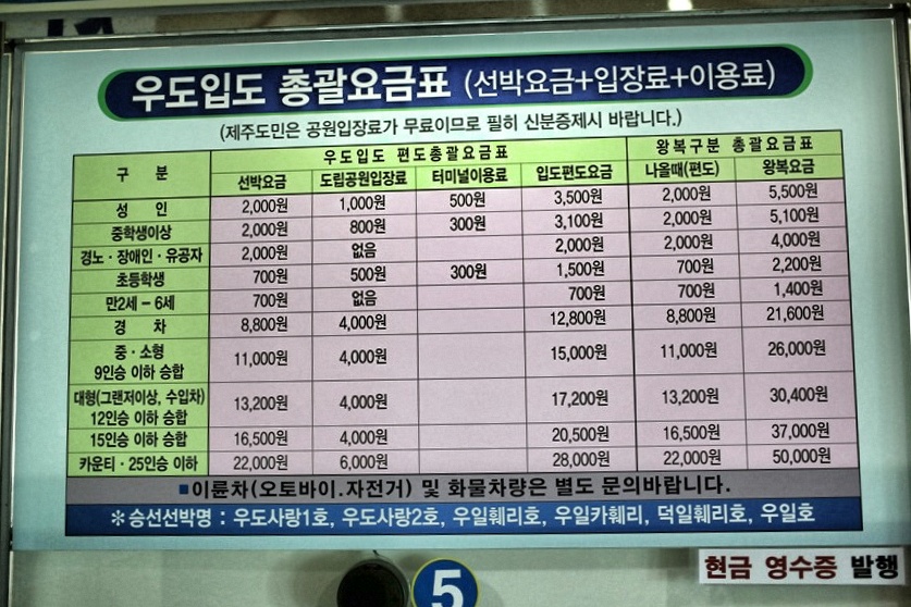 우도행 배요금은 이러했습니다 입장료도 따로 있었지만 괜찮은 요금 같았습니다