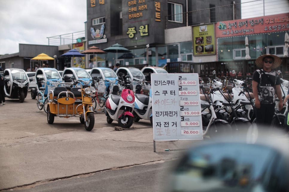 역시 다들 큰 바이크를 탑니다 왕발이라고 부르는 것 같네요 저게 아니면 차를 직접 가지고 들어오거나 버스로 섬 투어를 할 수 있다고 합니다 그리고 자차로 우도를 돌아보는 것에 대해 주의할 점이 있었는데 바로