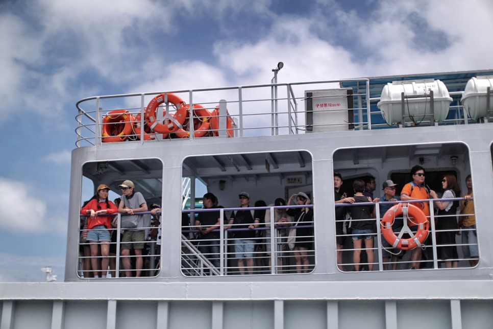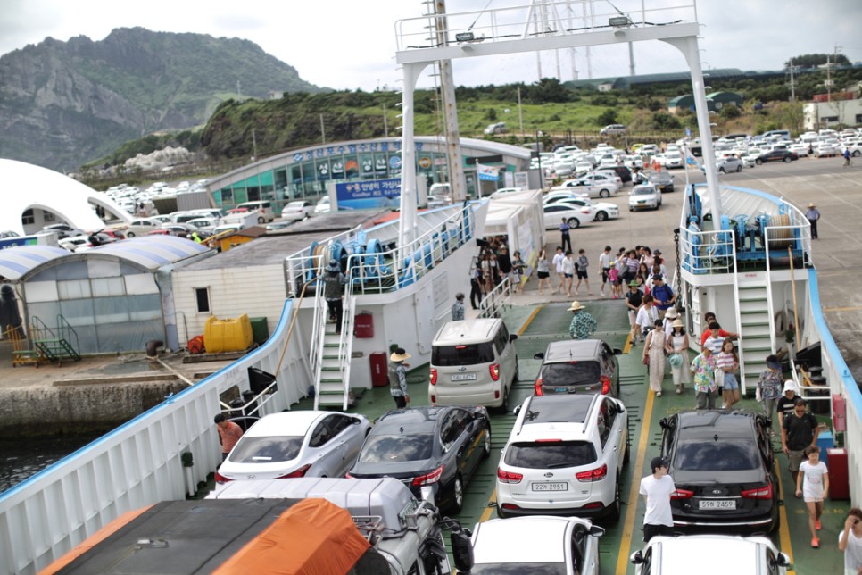 저게 그 유명한 성산일출봉이군요~ 생각보다 낮았습니다 그리고 들러볼까 했는데 언덕을 걸어올라가야 되는 것 같아서 고령의 틀니할머니와 땡깡쟁이 란이를 데리고 가기에 무리라는 판단으로 바로 패스를 합니다 다음에...올라가 볼께요 ㅜㅜ 흑흑 성산포항에 도착해보니 사람이 무지하게 많고 복잡했습니다 일본가족 모두의 여권이 필요했고 승선표에 인적사항을 다 적은 후에 티켓을 발급 받을 수 있었습니다 차량까지 함께 가지고 들어가는 것으로 티켓을 끊었습니다