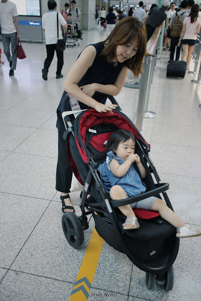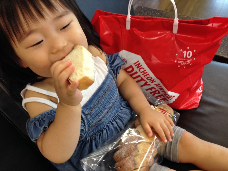 빵을 맛있게 먹으며 일본행 비행기에 오릅니다 ~ 태어난지 3주만에 타기 시작한 비행기 란이는 벌써 편도로 10번을 넘게 탔네요 저는 25살에서야 처음으로 비행기를 탔었는데^^: 덕분인지 비행중에 칭얼거리지 않아서 착한 란이입니다~ 1시간 조금의 비행 후 후쿠오카 공항에 도착합니다