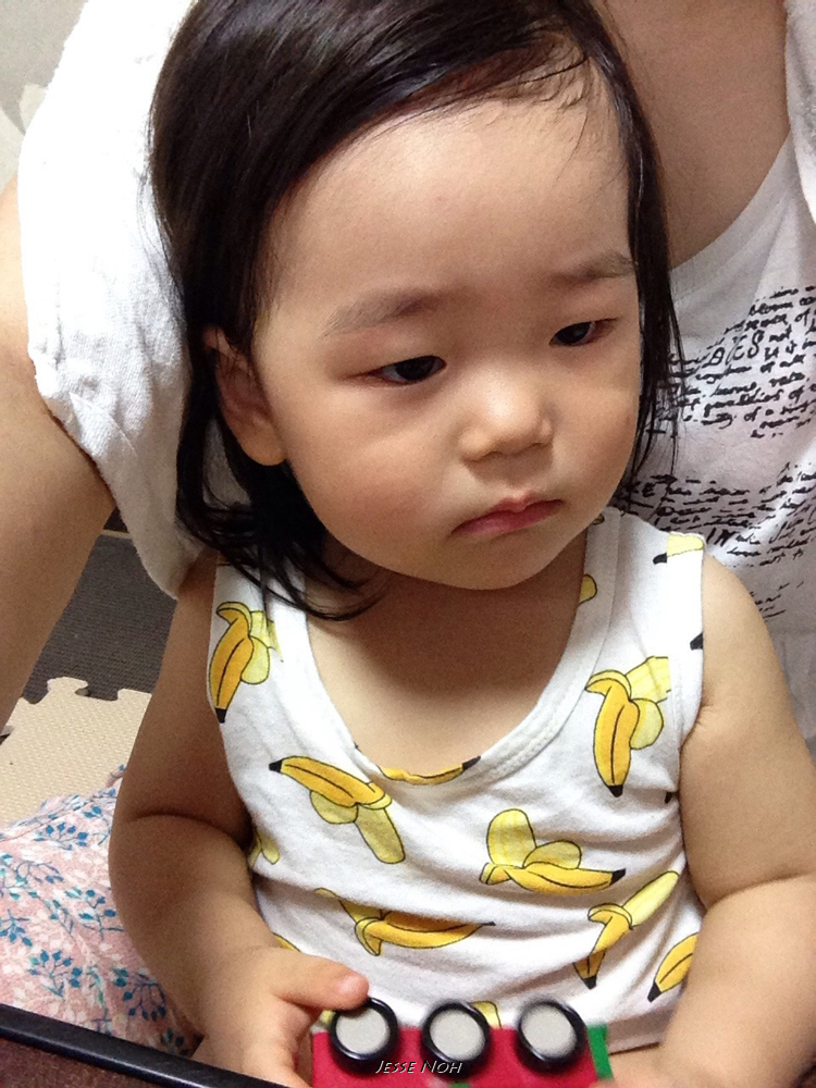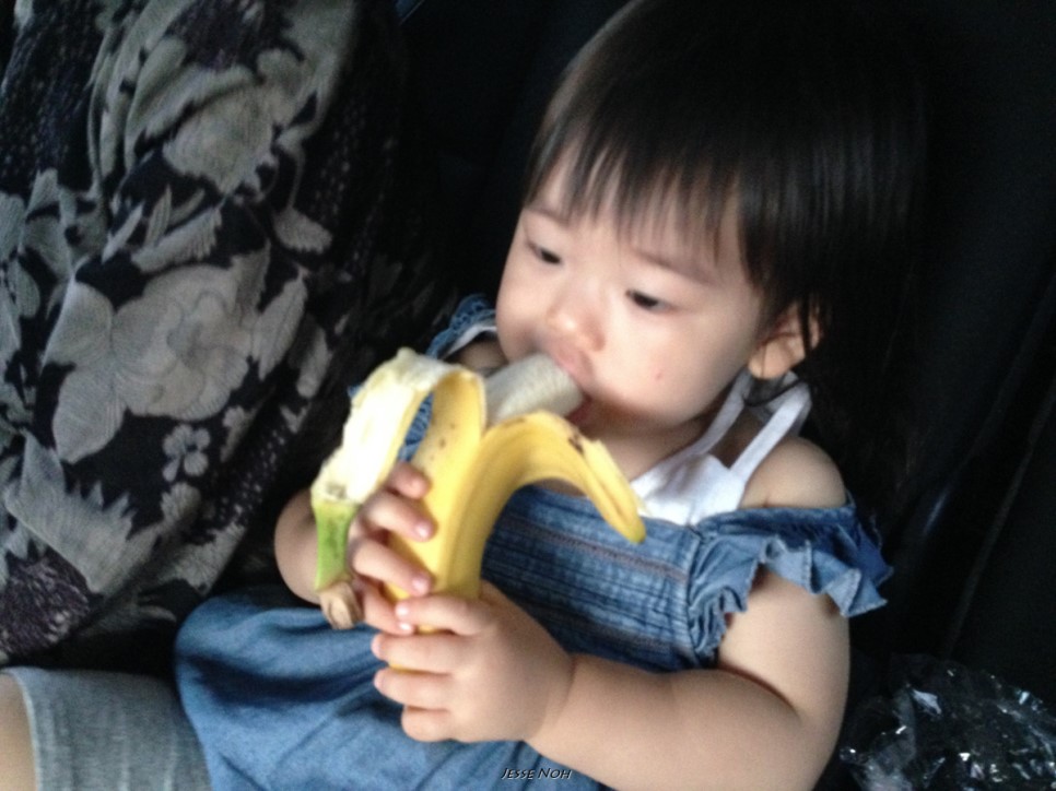 제주에서 미역국을 먹고 체했던게 아직 다 낫지 않은 란이는 이렇게 빵과 바나나로 끼니를 떼웁니다 어제 일본에 도착한 장인장모님과 할머니께서 하루를 큰딸 노리코씨 집에서 머물면서 에미씨와 란이를 기다렸다가 함께 오무타로 가게 되었습니다 (배려 감사합니다)