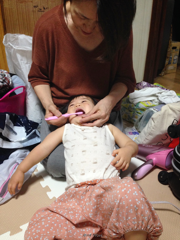 일본 본가에 와서도 어색해 하지 않고 '바바~바바~"를 외치며 외할머니와 양치를 하는 란이입니다 일본에서 태어났고 태어나기 전에 장모님과 함께 살았어서 그런지 이상하게 장모님을 잘 따릅니다