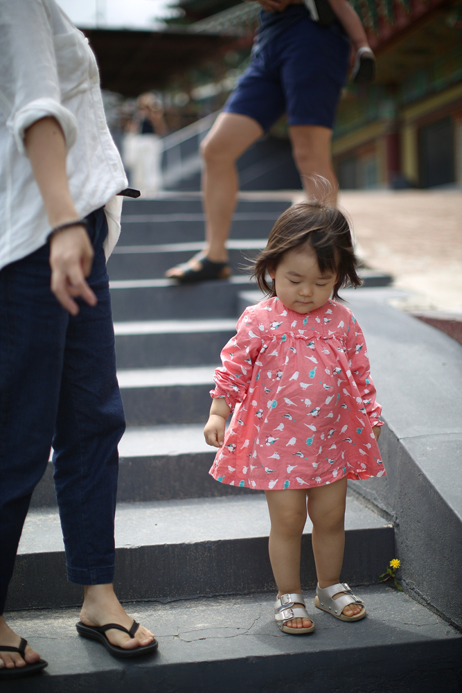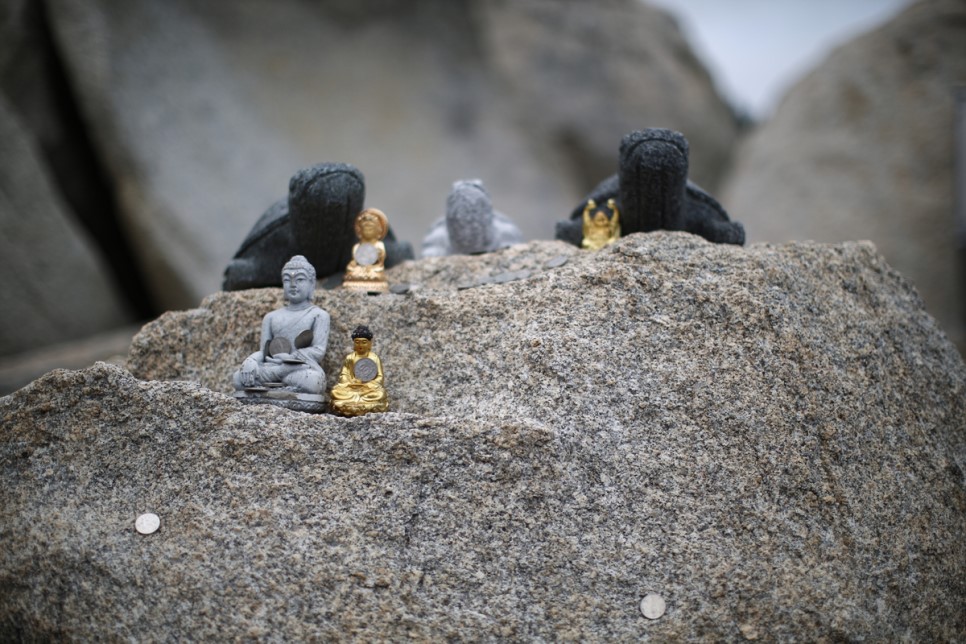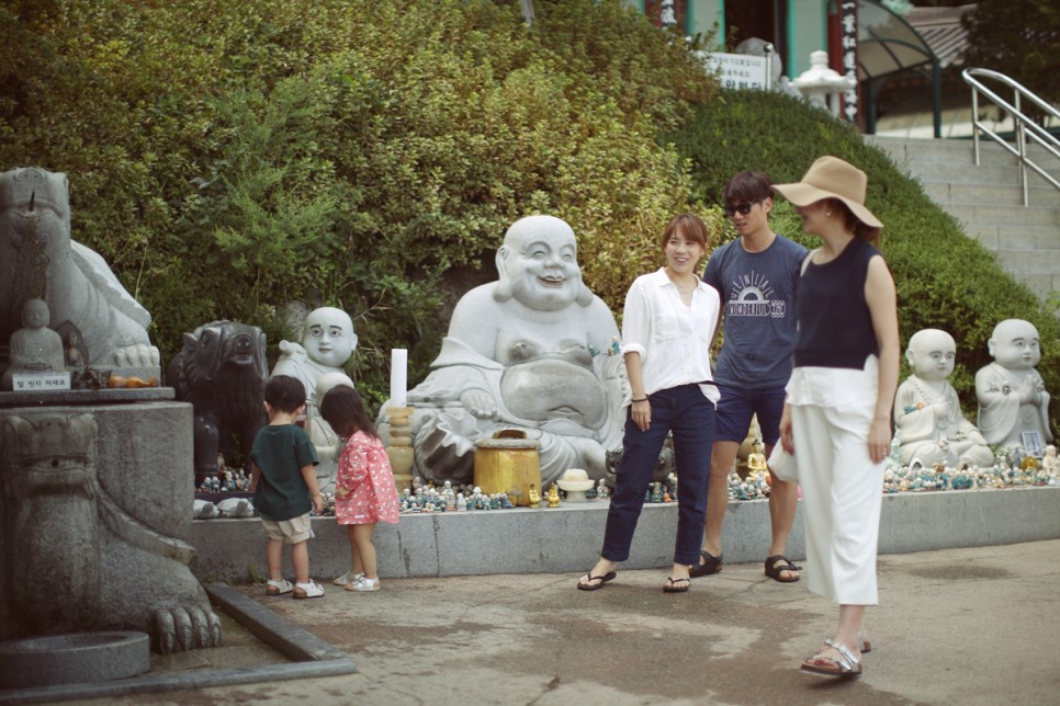 돌에 붙은 동전을 신기하게 보며 절에서 나옵니다