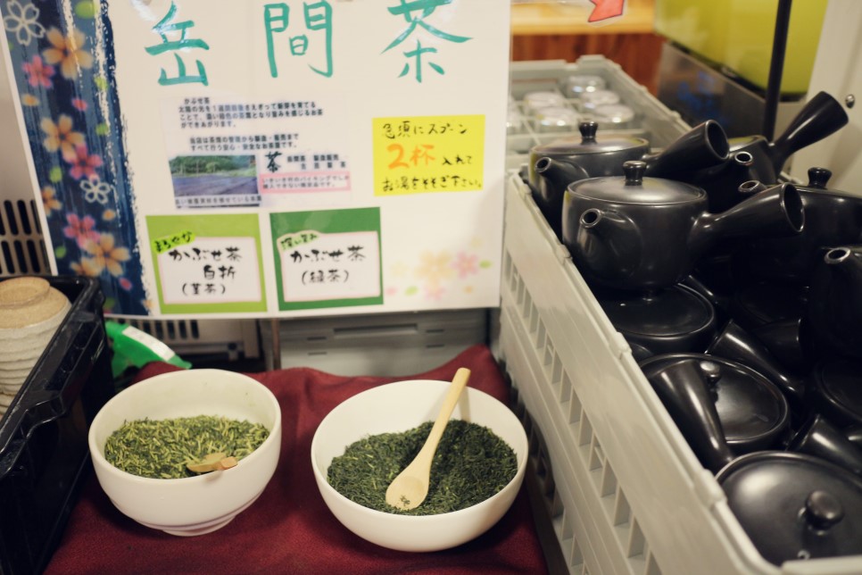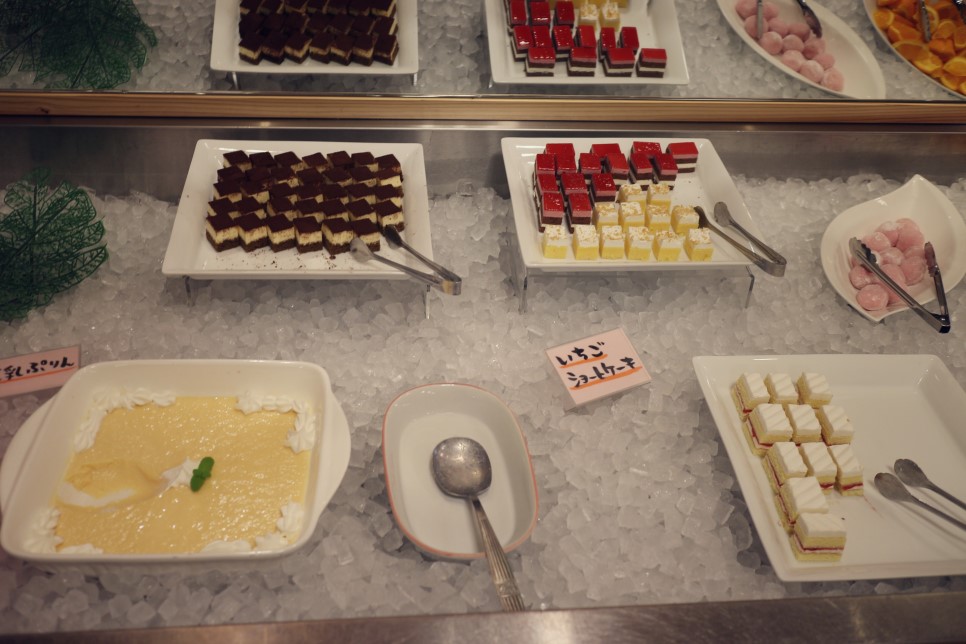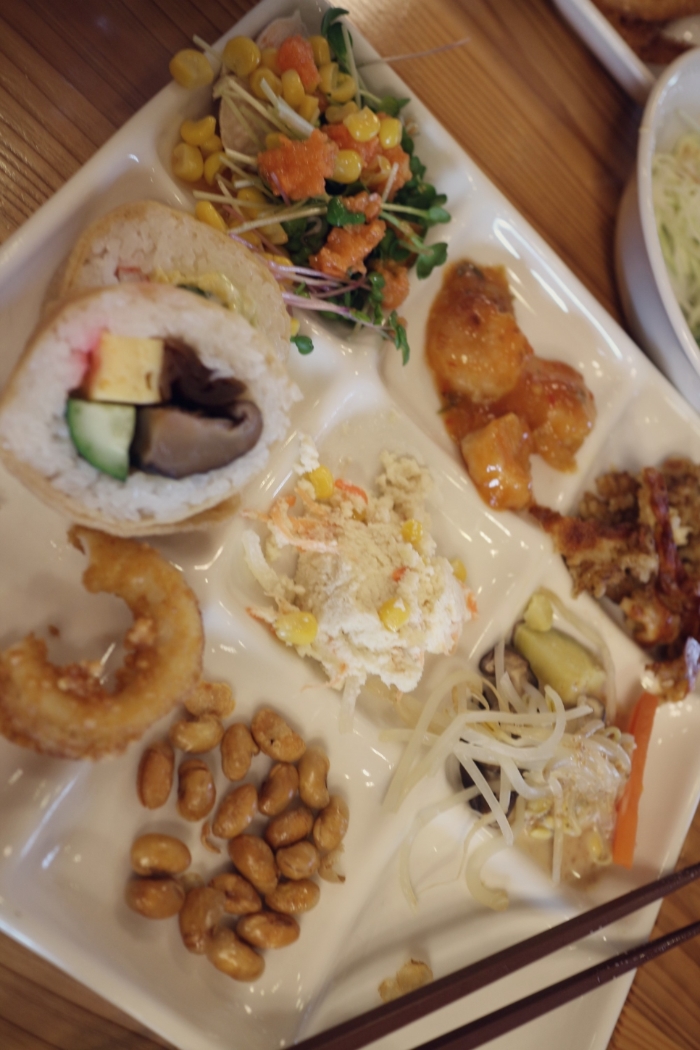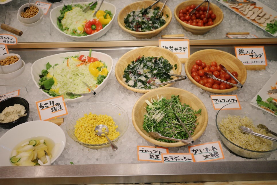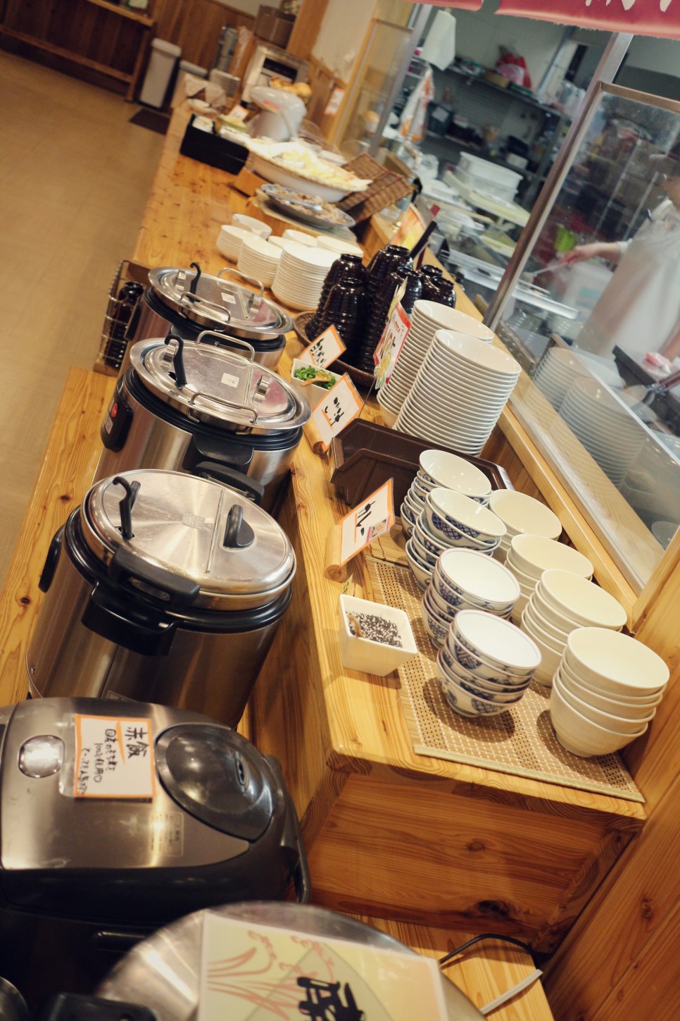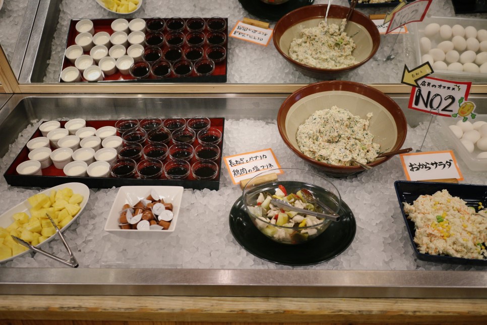 팥찹쌀밥(새치고항), 흰밥, 단팥죽, 카레, 미소시루(된장국), 잡곡밥 비슷한 야채가 들어간 밥 식사류가 준비되어 있고 그 뒤로는 즉석 튀김(덴뿌라)와 모밀(소바)이 있습니다 반대쪽에는 요리들이 있는데