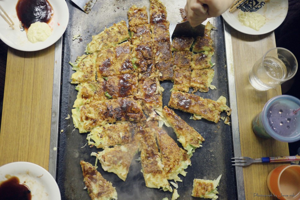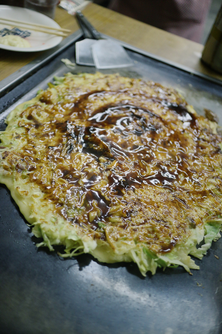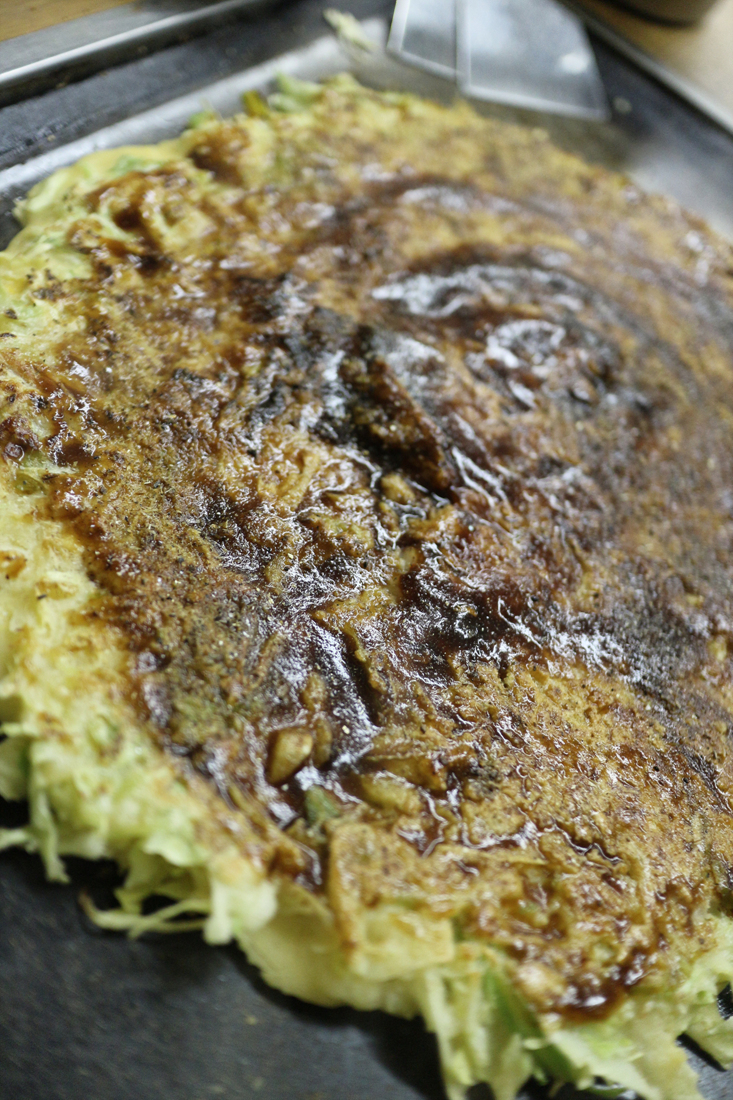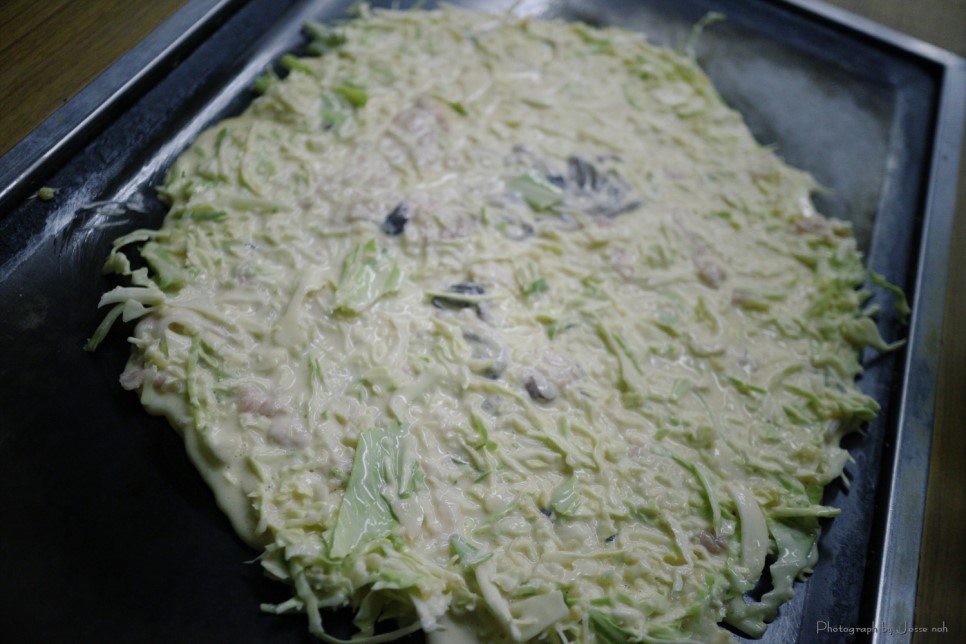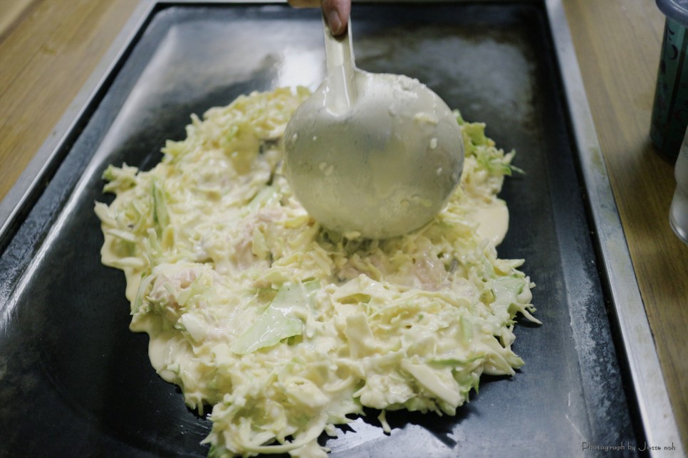 반죽위에 면을 올리고 그 위에 달걀을 올리는 전혀 다른 느낌의 오코노미야키 (개인적으로 히로시마스타일 강추입니다!)