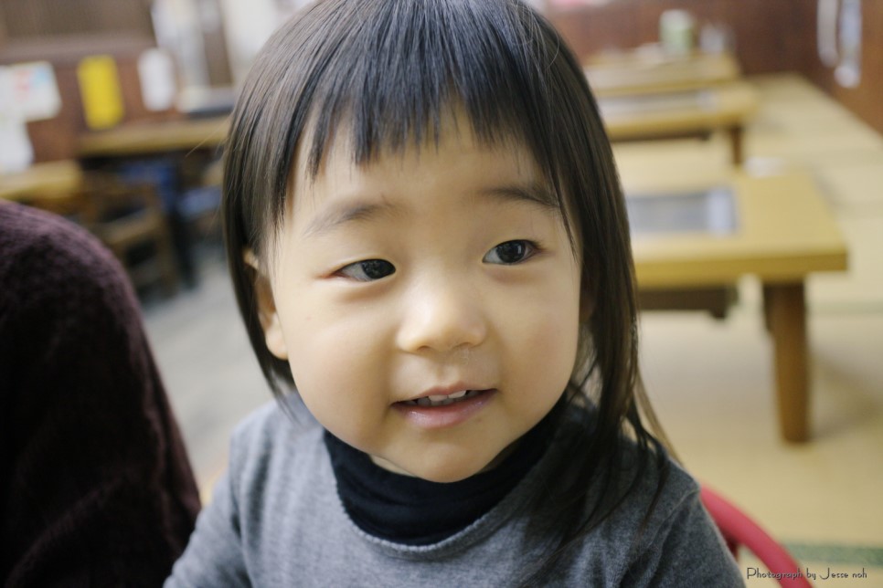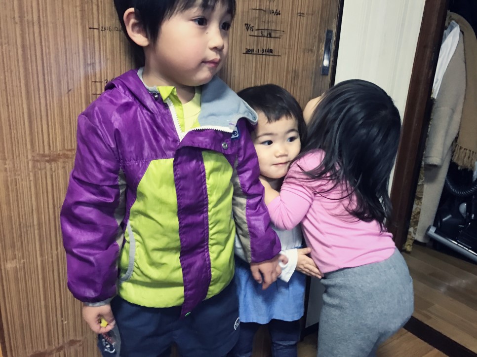 둘째 언니 리에코의 아이들 아들 카에데와 막내딸 리오! 엄청 자라고 있네요 그리고 뒤로는 60년정도 된 집이라는 흔적이 고스란히 보이는 엄마들의 아가시절의 키를 표시한 것과 지금의 아이들의 키 표시가 적혀 있습니다