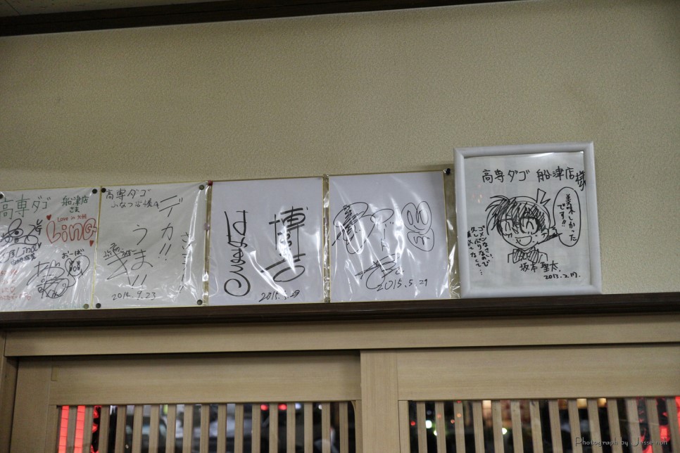 입구에서 봤던 커다란 철판은 주문을 하고 찾으러 오는 고객들을 위해 오코노미야키를 만드는 공간이였습니다 그렇게 가게를 나오고 있는데 뭔가 그림과 사인이 눈에 들어옵니다 유명한 집들에는 유명한 사람들의 사인이 있곤 한것은 한국이나 일본이나 비슷한데요