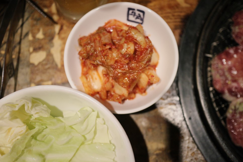 김치가 있고 상추쌈이 있고 일본과 한국에서 주문의 차이는 한국에선 주로 삼겹살먹자 하면 삼겹살만 먹고 갈비먹자 하면 갈비만 먹는데 이게 일본 스타일인지 처갓집 스타일인지는 모르겠지만 고기를 이것 저것 조금씩 종류별로 시켜서 먹습니다 제가 못 먹는 부위들을 지나