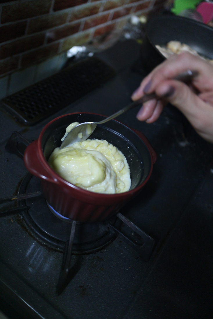 퐁듀 치즈에 고체 연료까지 완벽하게 준비가 되었습니다