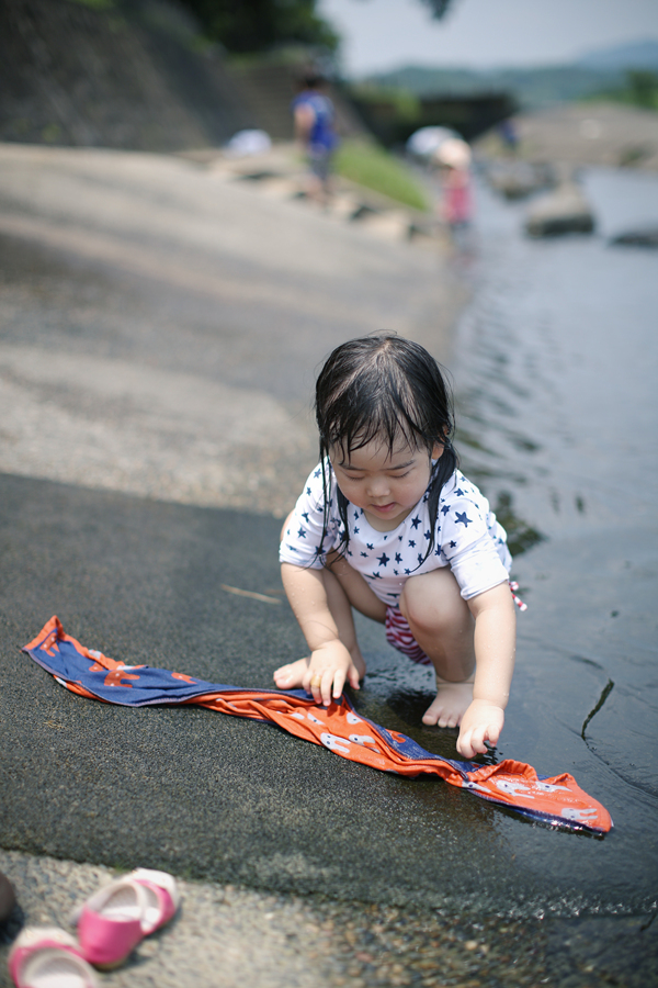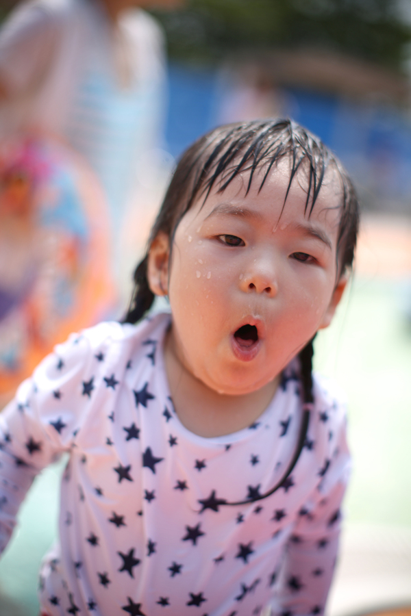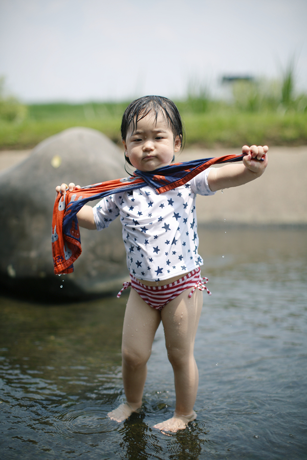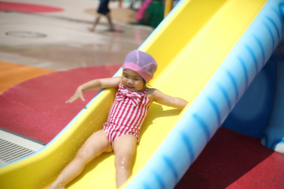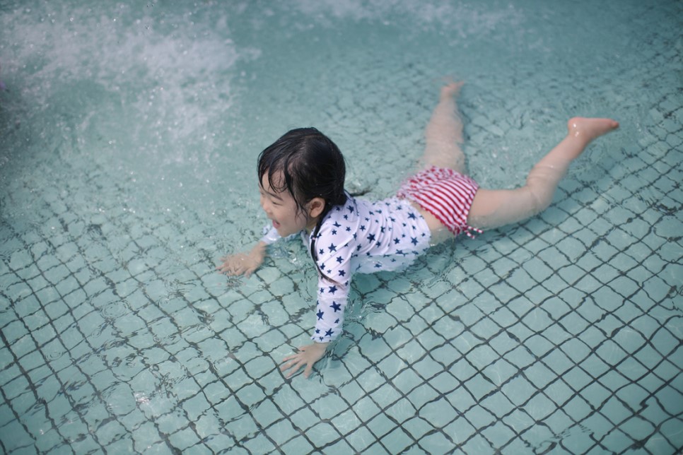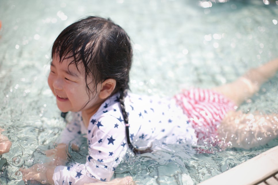 수영복을 입은 란이~ 오늘의 첫 물놀이 장소는 일본에서도 처음 와보는 곳입니다