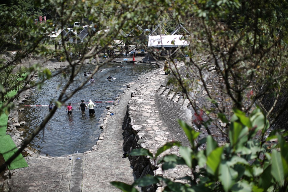 계곡과 수영장 사잇길로 입장을 합니다 수영장은 물론 무료입니다