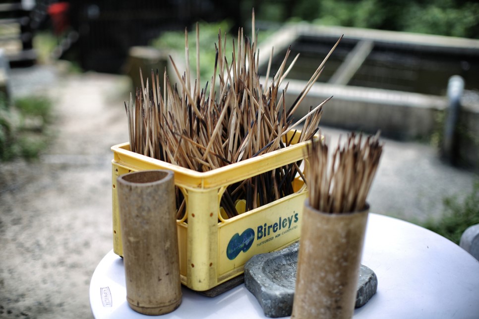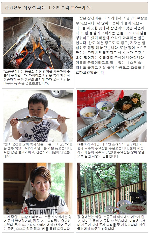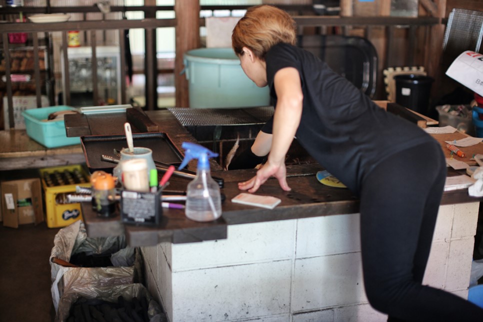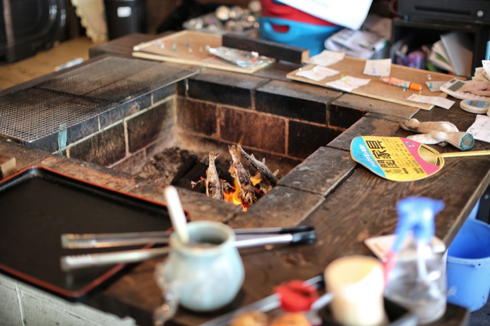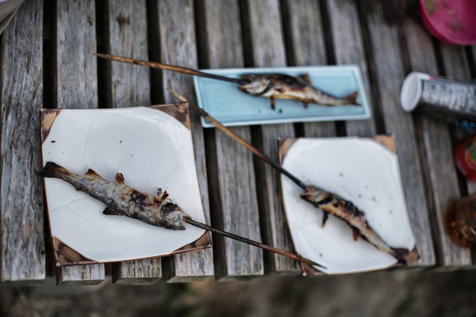 물고기를 건내주자 꼬지에 꽂아 화로에 넣어 구워줍니다