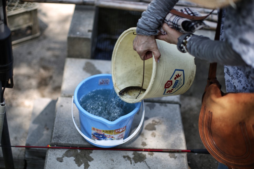저 뒷쪽은 잉어낚시 (잉어는 손맛만 잡으면 놓아줘야 함) 장인어른께서 혼자서 잉어낚시를 하심