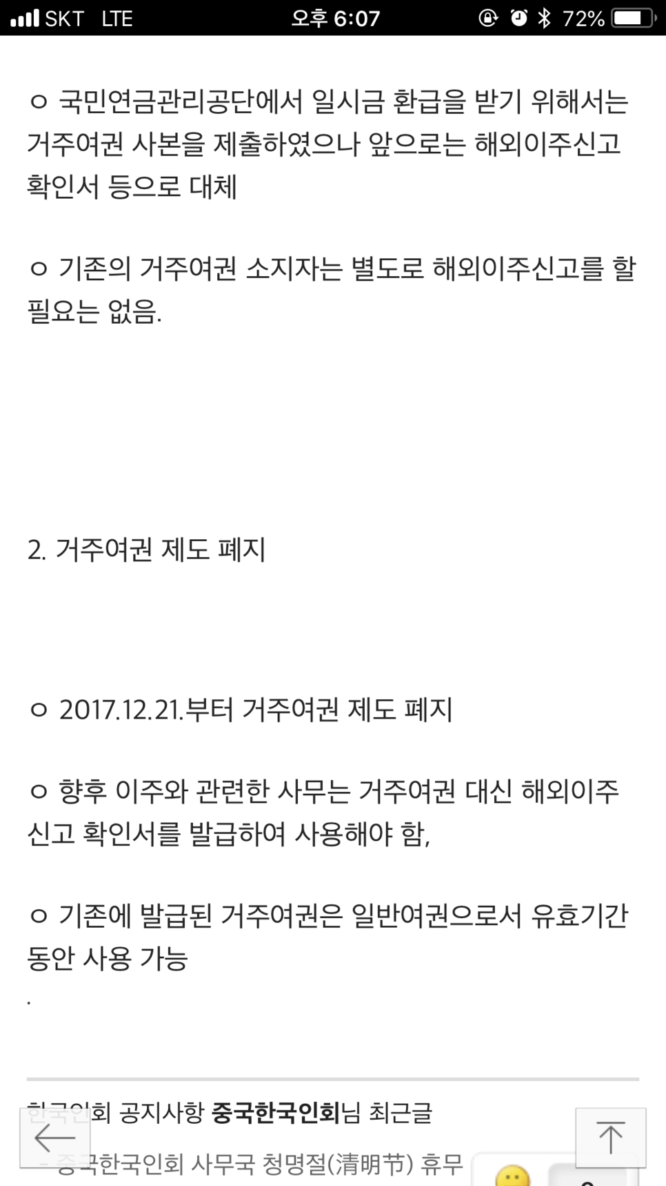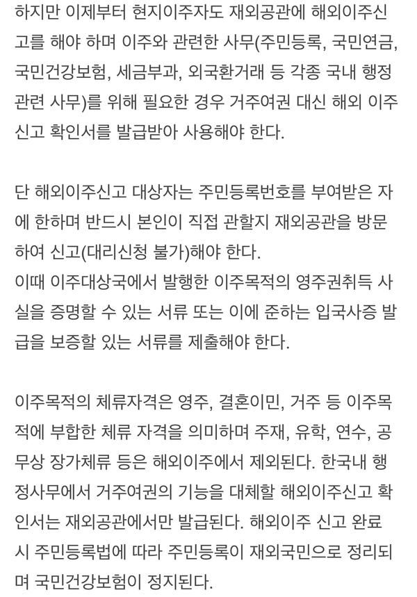 여기서 중요한 건 해외 이주목적의 체류 자격은 영주, 결혼이민, 거주로 제한 되어 있었습니다 이걸 신청해야