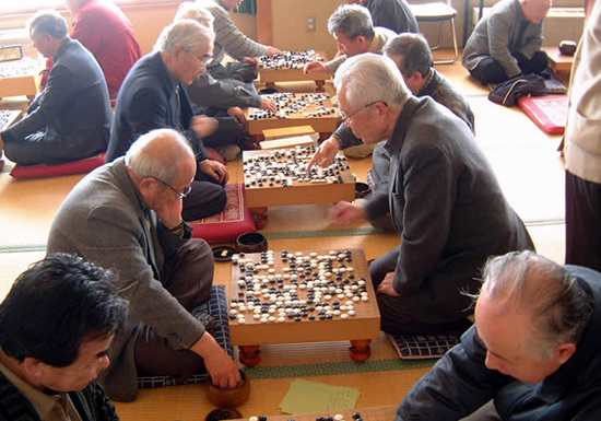 ▲ k시 공민관에서 바둑을 두셨던 분들. 사진은 2004년의 겨울에 찍은 것으로 시기적으로 이번 회의 약 3년 후에 촬영한 것이 된다. 그런데 정작 내 마음을 헤집어 놓은 것은 공원 바로 옆의 3층짜리 조그만 건물에 붙어있던 '바둑(囲碁, 일본어로 '이고'라고 읽음)라는 간판이었다. 무언가에 끌리는 듯 천천히 계단을 올라가 '囲碁'라고 적혀있던 불투명한 유리문의 도어를 조심스럽게 열었다. 15평 남짓 될까? 백발이 성성한 할아버지 대여섯과 젊은이 두서넛의 바둑돌 놓는 소리가 청아하게 울려 퍼지고 있다. 내딴에는 조심스럽게 연 것이었는데, 중앙에서 다른 이의 바둑을 선 채로 보고 있던 묘한 기품을 느끼게 하는 할아버지 한 분이 이쪽으로 고개를 돌린다. "어서 오세요. (사이) 처음 보는 얼굴이네" "아...네. 안녕하세요. 여기는 바둑을 두는 곳인가요?" "......?" "저는 '박'입니다. (바둑돌을 놓는 손짓을 하며) 그러니까 여기는 바둑을 둘 수 있는 곳인가요?" "(사이) 아! 외국인? 어디서 왔나? 중국? 아니면 한국?" 바둑용어 따윈 배웠을 리가 없는 어설픈 내 소개와 일본어를 반복해서 들은 후에야 할아버지는 내가 외국인임을 눈치챘다. 그리고 기원내의 모은 사람들의 시선이 나에게 꽂혔다. 목소리는 더듬거린다. "...한, 한국에서 왔는데요" 신분을 밝히자 여기저기서 한마디씩 터졌다. "오! 조훈현 9단의 나라에서 왔군. 아참, 이젠 이창호 9단이 최곤가?" "여긴 중국인은 온 적 있지만, 한국인은 처음인거 같은데?" "한국이면 류시훈 7단 알겠군. 여기 근처에 살거든. 그래서 축제 때는 일부러 와서 지도기도 줘두지" "한국바둑 정말 센 바둑이지. 아마 제일 강하지 않나?" 그나마 고유명사가 많이 나와서 대강 알아들을 수 있었지만, 말 자체는 무진장 빨랐다. 당시만 하더라도 학교에서 배우는 정식(?) 일본어와 아내의 여성스러운 일본어 및 존대어를 배우고 있던 나에게 있어 이들의 반말 속사포는 너무나도 신선했다. 내가 찾아간 곳은 물론 '기원'이었고, 제일 먼저 말을 걸었던 할아버지가 기원의 원장으로 카운터 옆 벽에는 그가 아마 9단(?)임을 나타내는 인가증 비슷한 게 걸려 있다. 기료는 시간에 상관없이 500엔. 커피는 처음 한잔만 서비스로 주고, 이후엔 100엔을 내야만 했다. 대신 녹차는 무료로 마실수 있는 시스템이었다. 500엔이 부담스러웠긴 했지만, 그렇다고 쎄다고 느껴지지도 않았다. 지난 몇년간 잊고 있었던 바둑의 재미를 이국땅의 색다른 분위기에서 즐길 수 있다는 흥분에 비한다면 결코 비싼 것이 아니다. 또한 저자거리의 생생한 일본어를 경험할 수 있었다는 것도 컸다. "그래. 박상이라고 했지? 박상은 얼마나 두나?" 정적을 깬 것은 원장 할아버지였다. 한국에서 기원바둑으로 4급정도 두었었지만, 3년정도 두지 않았던지라 5급정도 둔다고 말했다. 그러자 날 쳐다보던, 호기심과 기대에 가득찼던 눈빛들은 싸그리 실망으로 바뀌었다. "아! 그래? 그렇구만. 다 잘두는 게 아닌가 보네..." "5급이면 여기선 다 접어야 할 것 같은데..." 아저씨들은 이런저런 혼잣말을 내뱉으며 조용히 자기네 자리로 돌아가 다시 청아한 바둑돌 소리를 냈다. 잠시 소란스럽던 기원의 공기는 이내 잠잠해졌다. 어떻게 해야할지 몰라 '멀뚱'거리며 서 있자, 원장 할아버지가 자리를 권해서 앉으라고 하더니만 낮은 목소리로 이렇게 말한다. "9점 정도 깔아보지" 이런... 서능욱 9단하고 지도 다면기를 뒀을 때도 7점 깔았다. 한때는 3급 수준이라는 말까지 들었던 적도 있는데, 9점을 깔라니. 이런 모욕은 오랜만이다. 9점 접바둑은 도저히 받아들일 수 없어서 오른쪽 손을 활짝 폈다. "5점?" "네. 5점" 원장 할아버지는 지긋이 웃으면서 그러라고 하신다. 하지만 포석이 지나고 중반전 들어서면서 그의 착점 스피드가 점점 느려지더만 엄청난 장고에 돌입하기 시작했다. 속기를 즐겨두는 나역시 오랜만에 장고를 하기 시작했다. 밀고 밀리는 접전이 계속되자 주위의 어른들이 하나둘 바둑판 주위로 몰려들더니 쑥덕거린다. "5점? 5점 깔았다고? 9점이 아니고?" "엄청난 바둑이잖아. '급'이 아닌거 같은데" 그랬었다. 일본식 단급제도로 따졌을 때 내 바둑실력은 5급이 아니었다. 원장 선생과의 이 바둑은 2집 차이로 아깝게 패했지만, 그는 내 개인 바둑용지를 만들어 주면서 "아마 4단"이라고 적어 넣었다. 한국의 5급이 일본에 와서 순식간에 아마 4단이 돼버린 것이다. 꿈에서나 그리던 '단(段)'을 이렇게 쉽게 획득하다니...... 원장과의 바둑이 끝나자 서로 두고 싶다고 말을 걸어 온다. 아마 3단을 상대로 두판을 내리 이기고, 아마 5단하고도 2승 1패를 기록했다. 한국의 기원 아저씨들에게 단련된 싸움바둑이다. 실력만 엇비슷하다면, 모양을 중시하는 일본바둑에 질 리가 없다. 빈삼각이 수시로 등장하는, 일단 끊고 보는 무뢰배 바둑을 온실속의 화초바둑이 어떻게 당해낸단 말인가? '띠리링 띠리링...' 아마 5단 아저씨와 4번째 대국을 진행하고 있을때 휴대폰 벨이 울렸다. 아내였다. 시간을 보니 어느새 6시 15분이다. 신선놀음에 도끼자루 썩는 줄 모른다는 말이 있는데, 지금 내가 딱 그 꼴이다. 아마 5단에게 양해를 구하고 잠시 복도로 나왔다